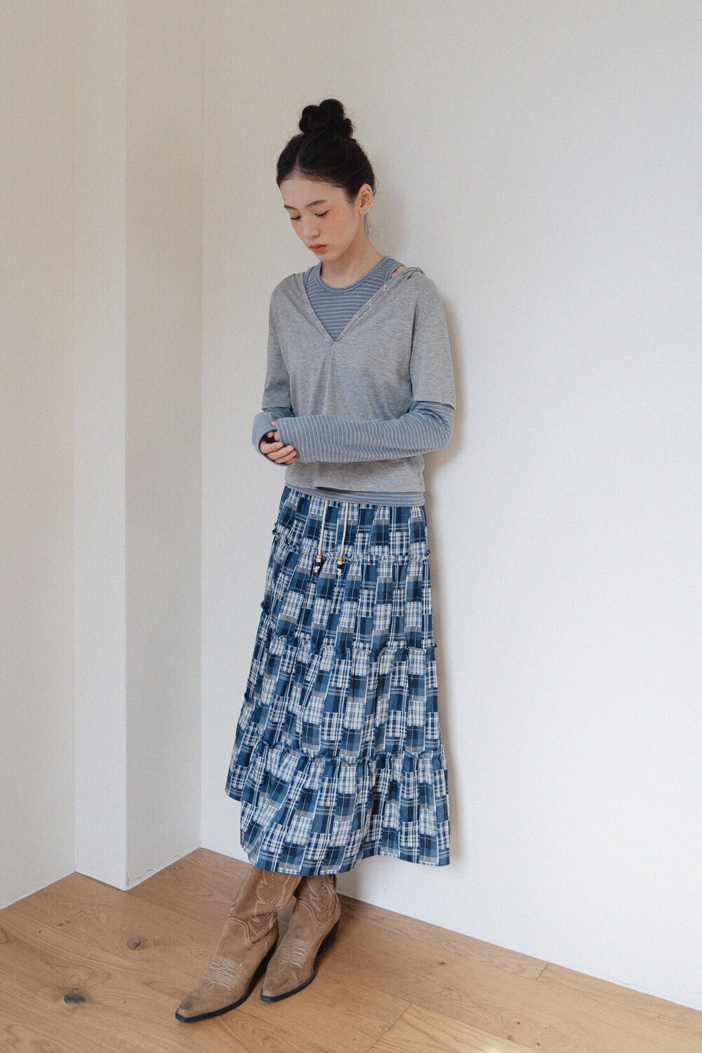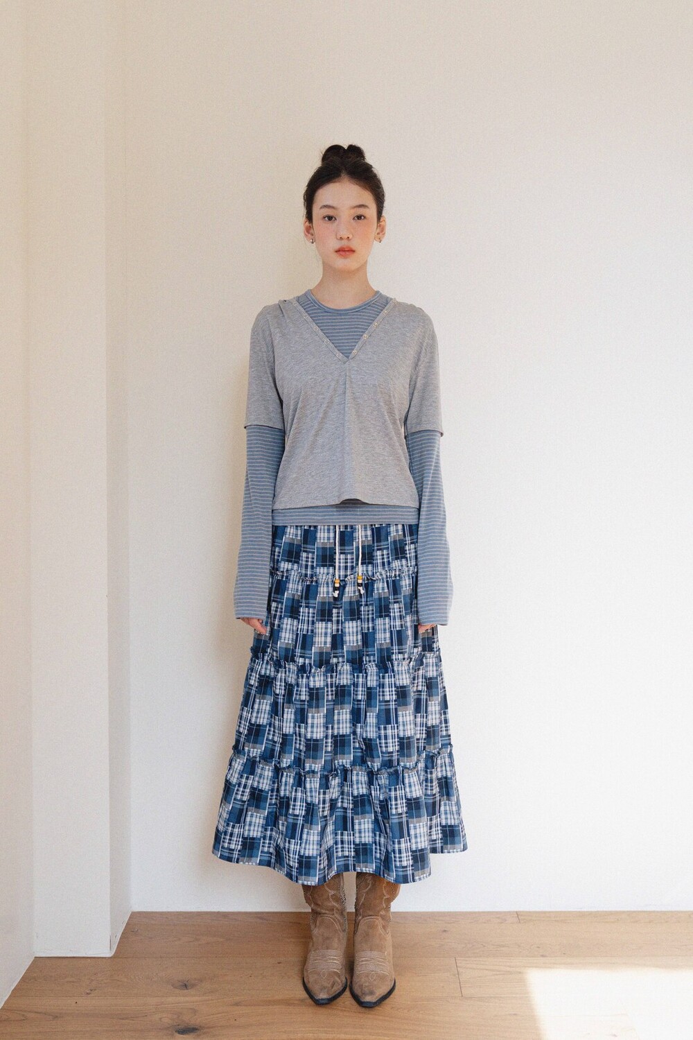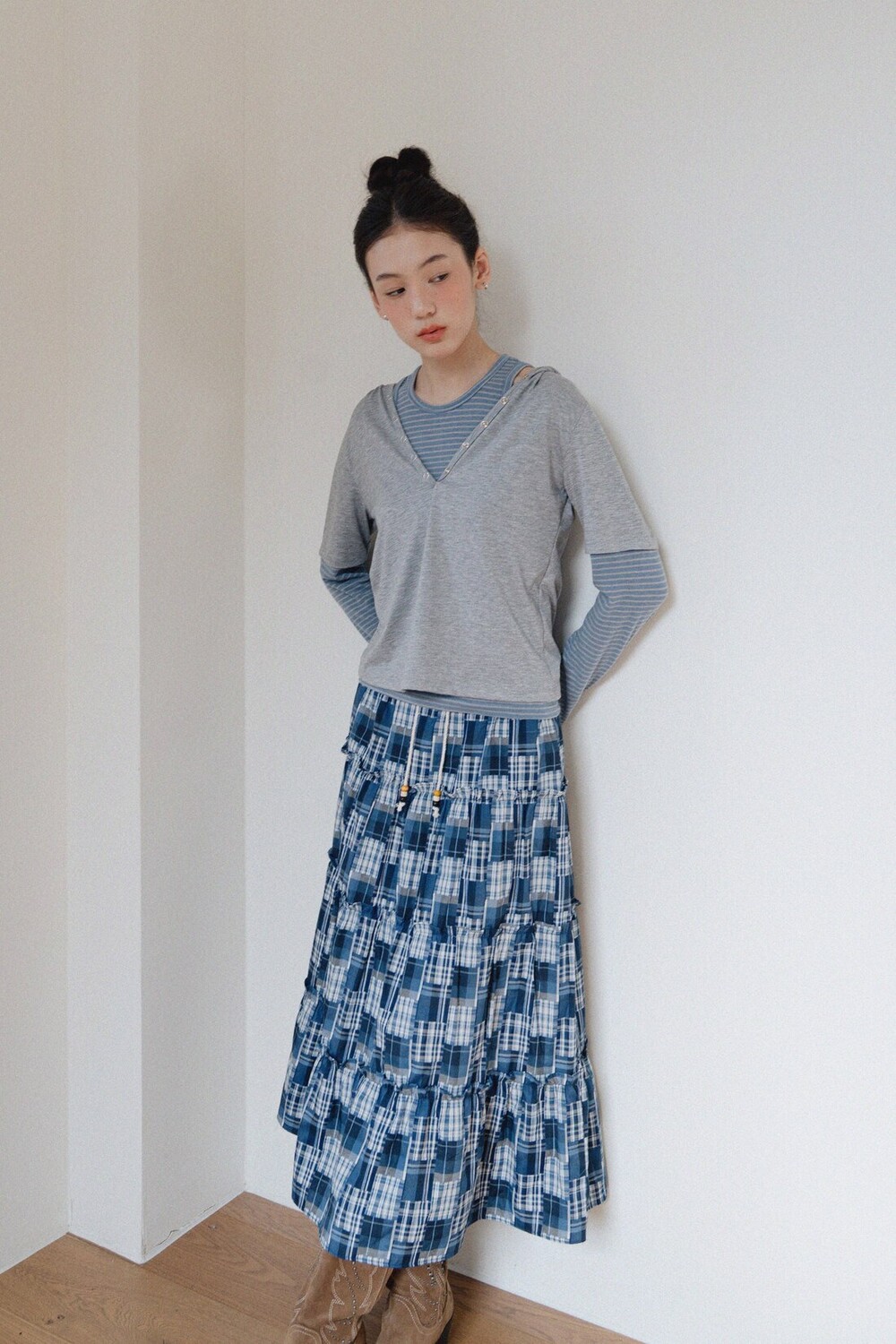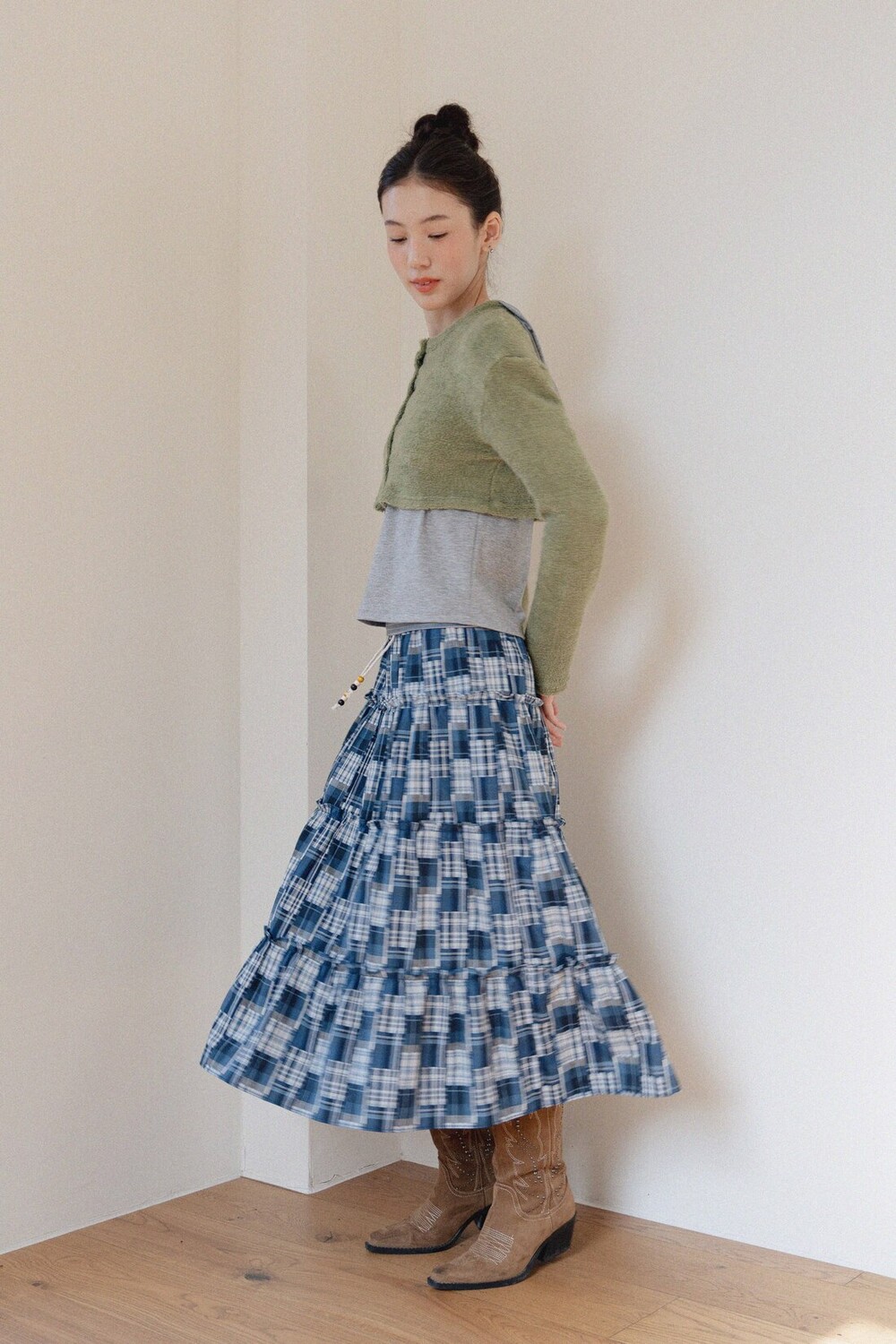 Patch Check Long Skirt-Blue