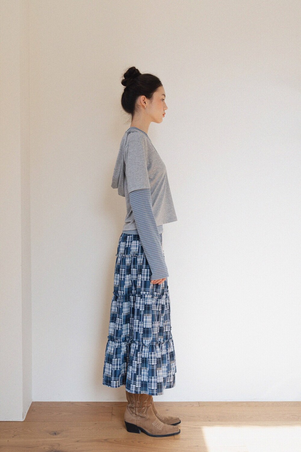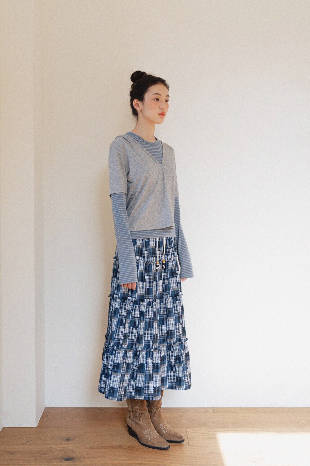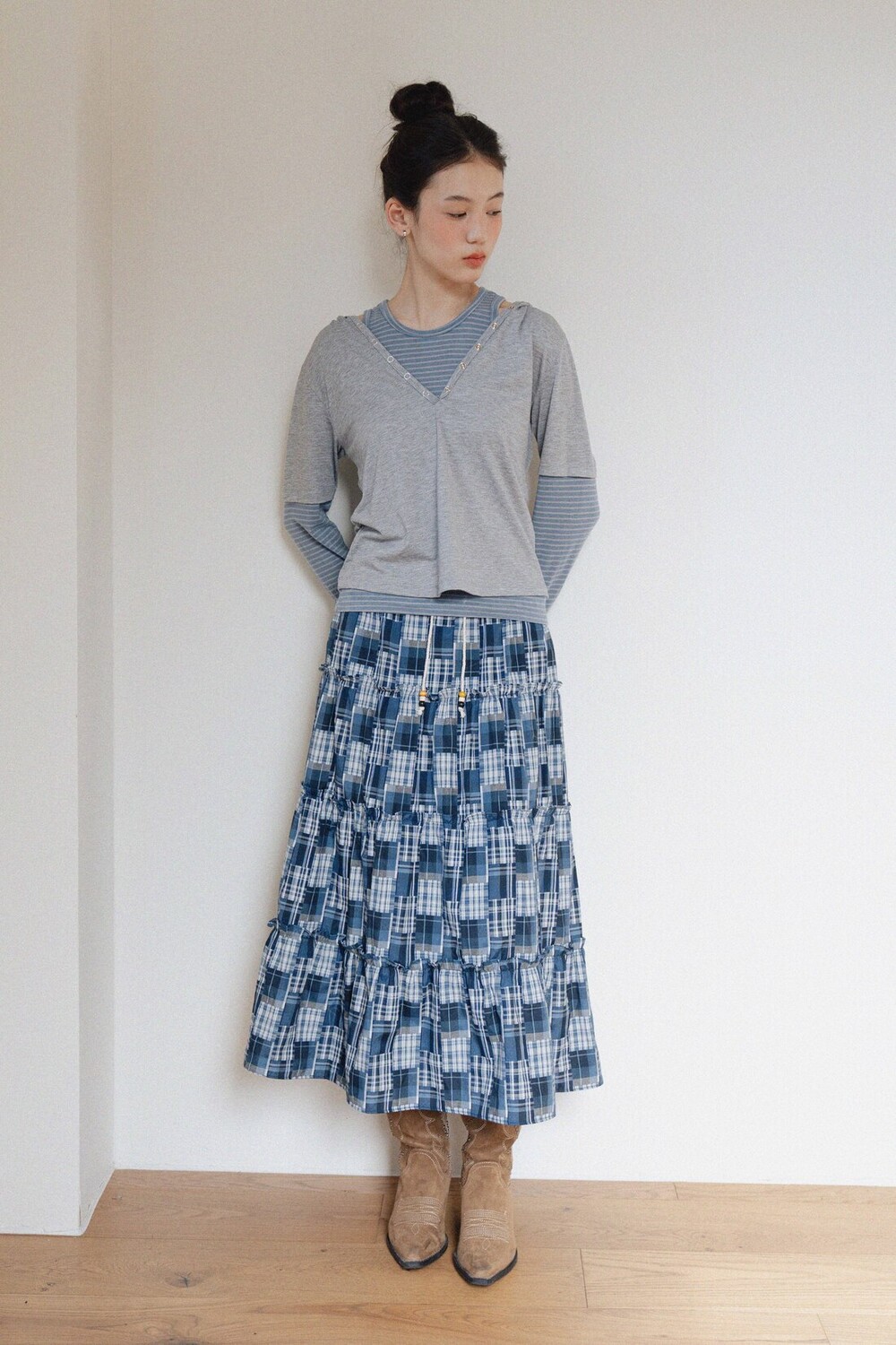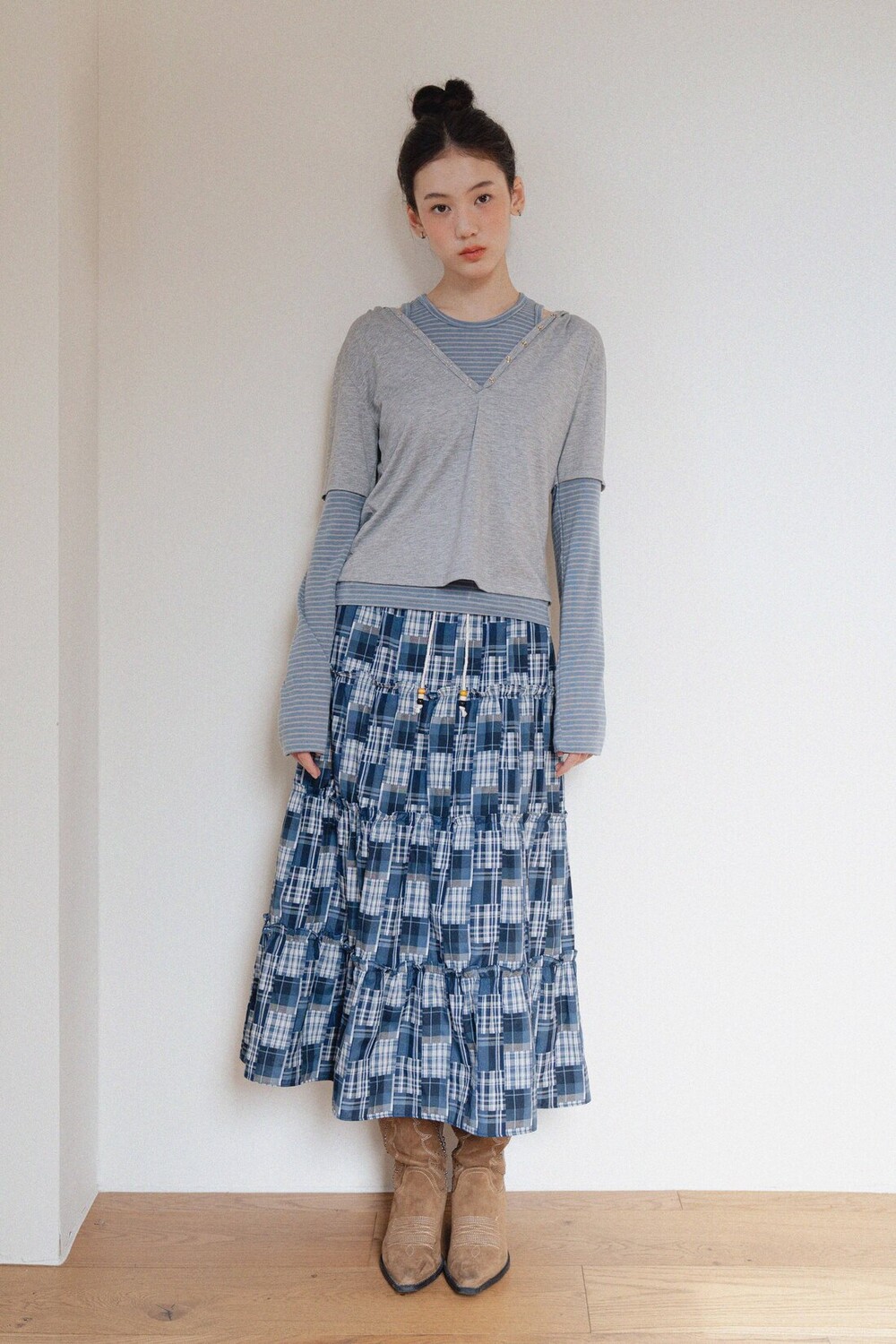 Patch Check Long Skirt-Blue