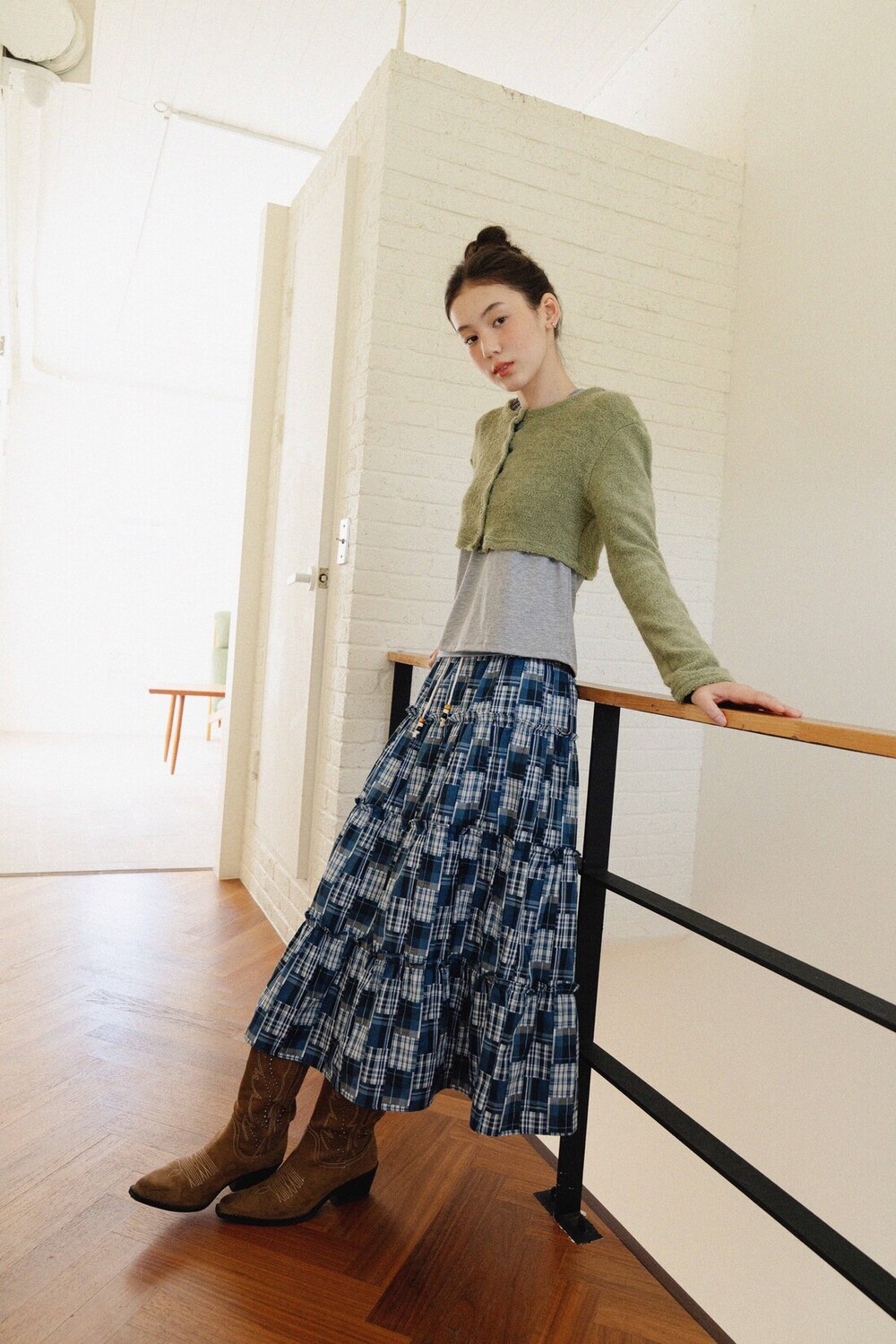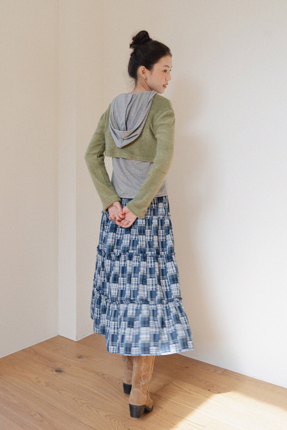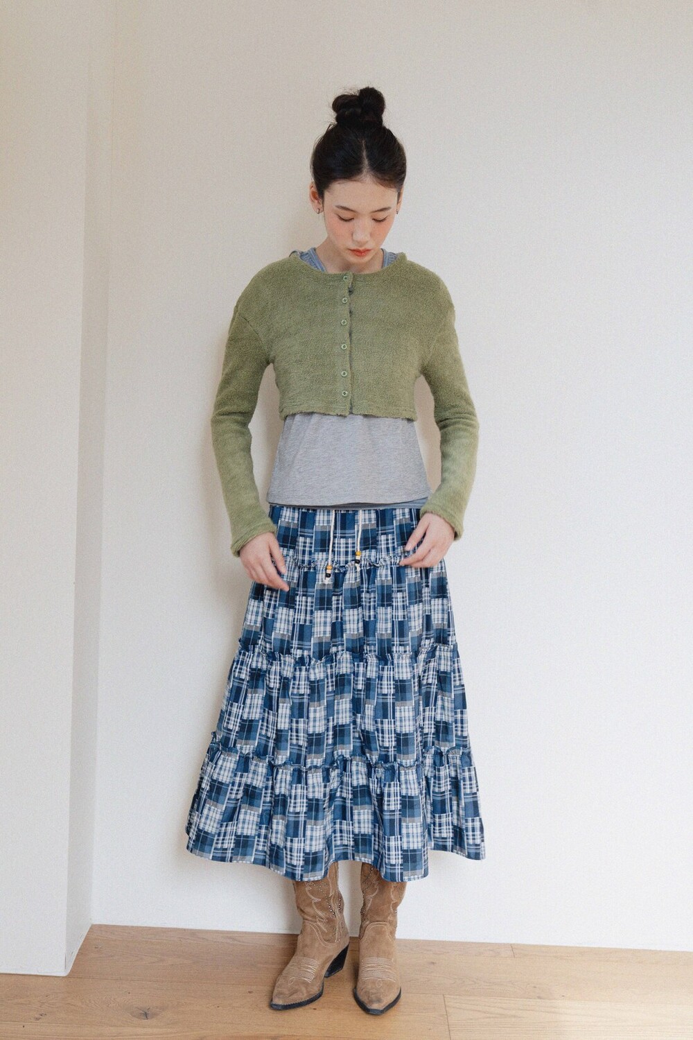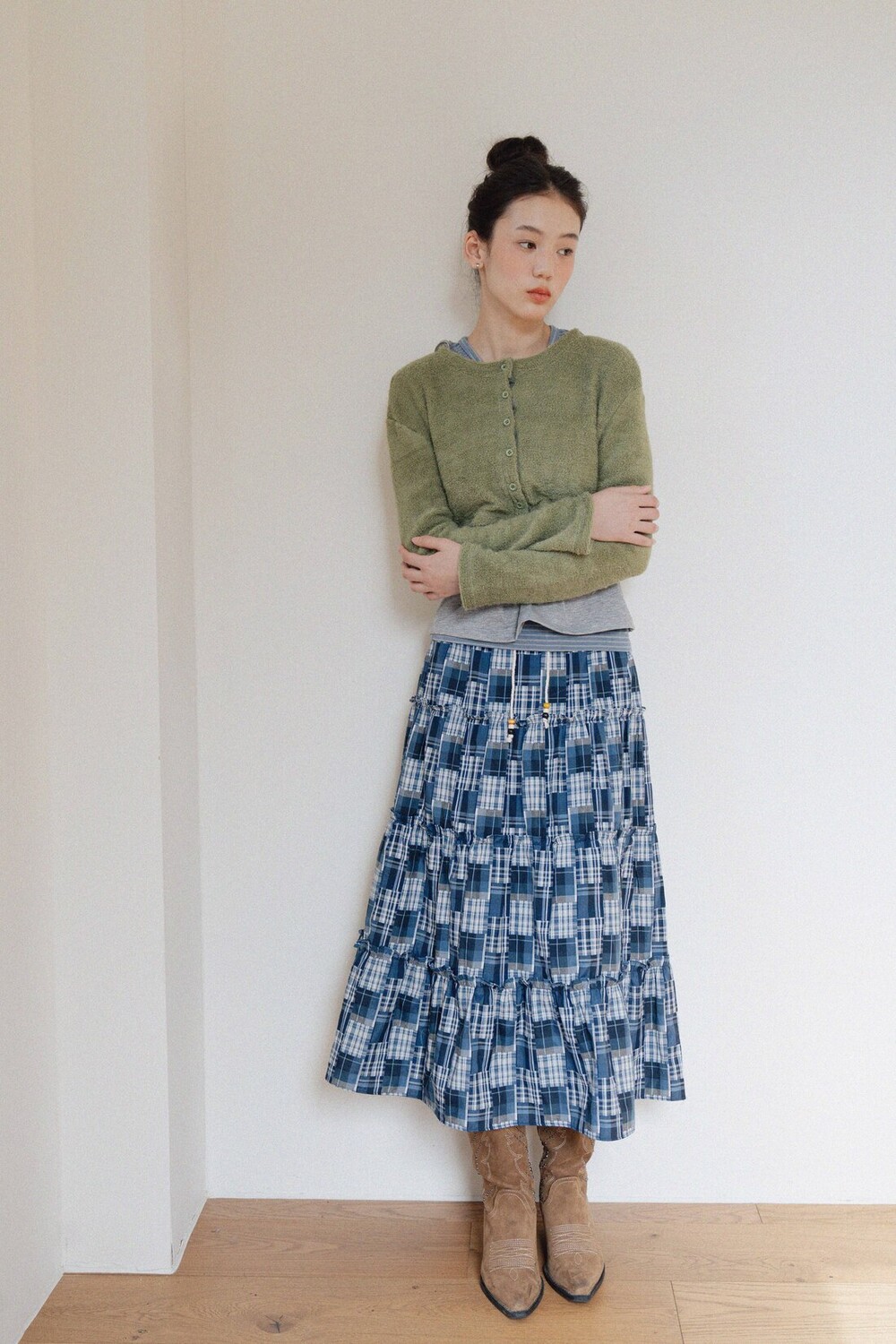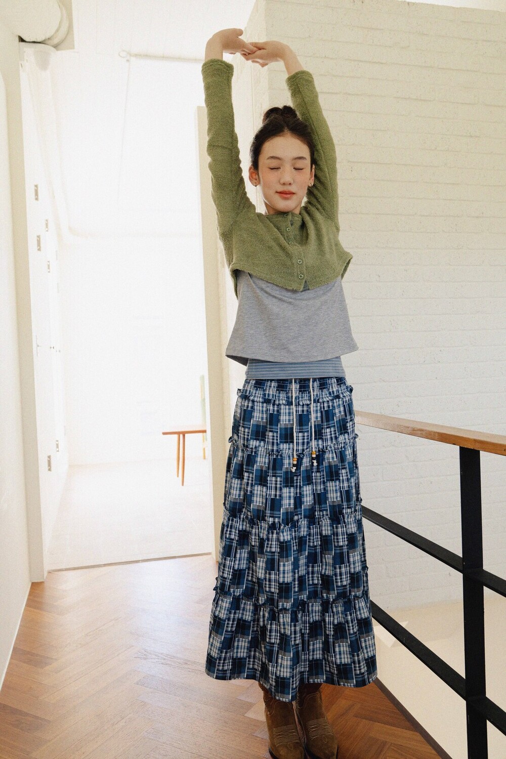 Patch Check Long Skirt-Blue